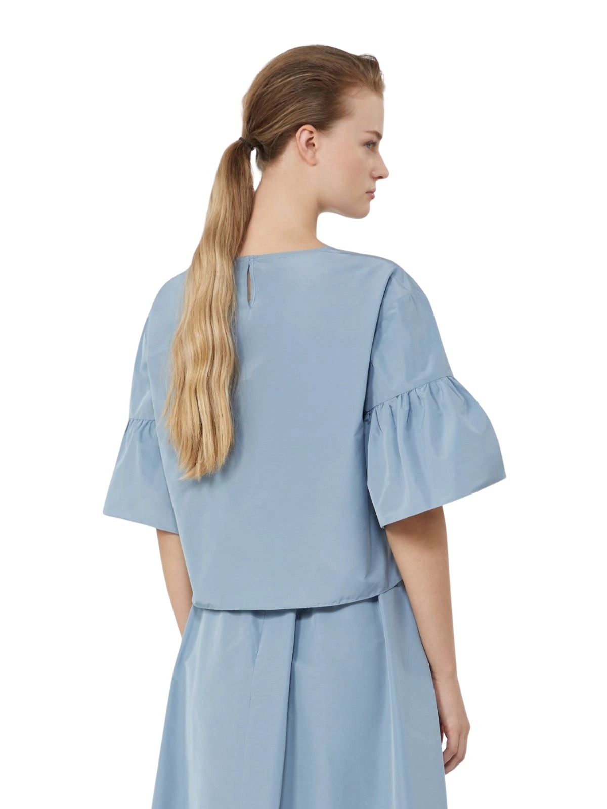 Kort topp til dame fra Weekend Max Mara, laget i lett og strukturert bomullsblandet taft kvalitet. Modellen har en boxy passform med vide klokkeermer, rund hals og dekorativ dråpeåpning med knapp bak. En moderne og feminin bluse som passer perfekt til både matchende skjørt og dressbukser.