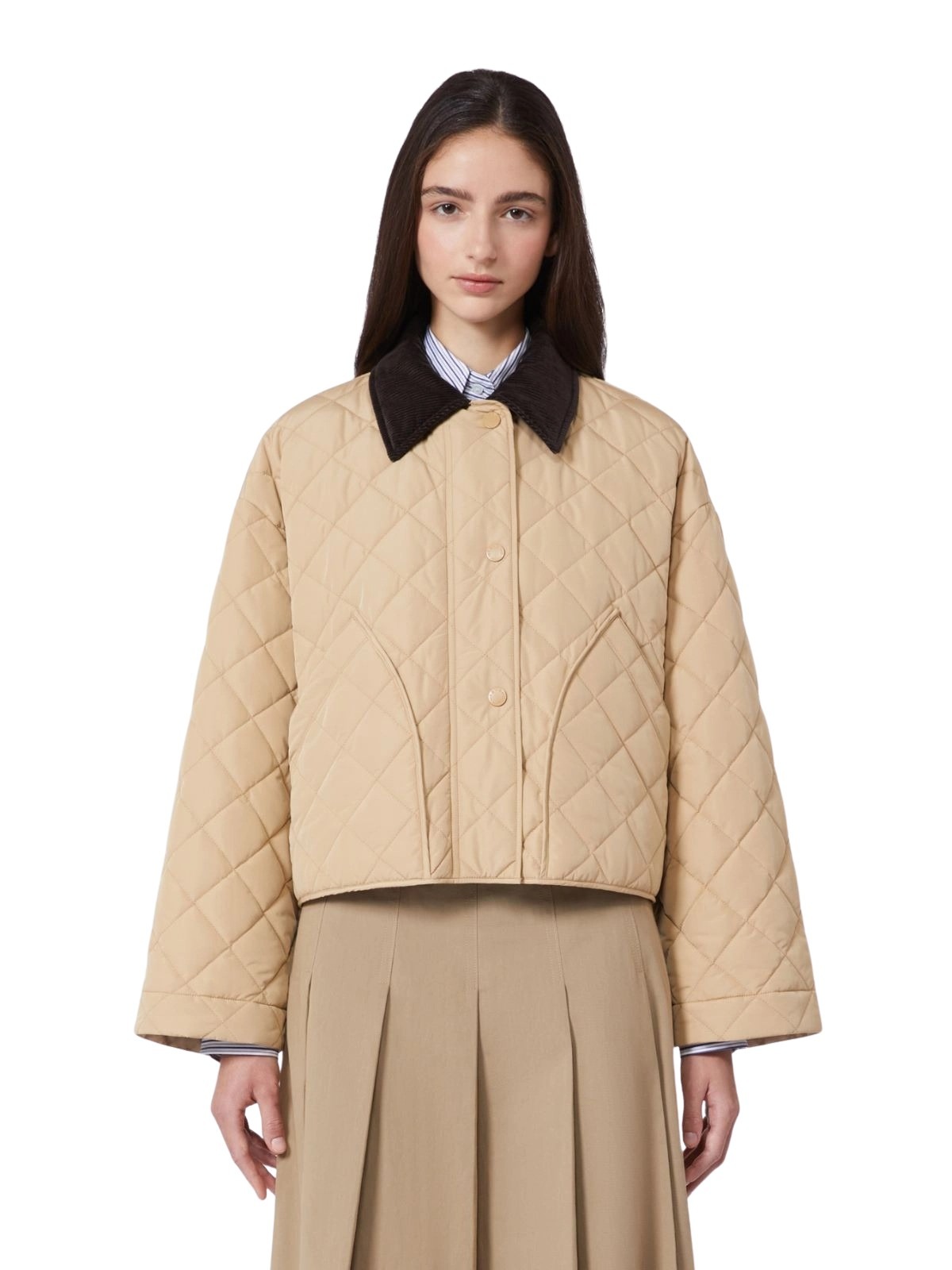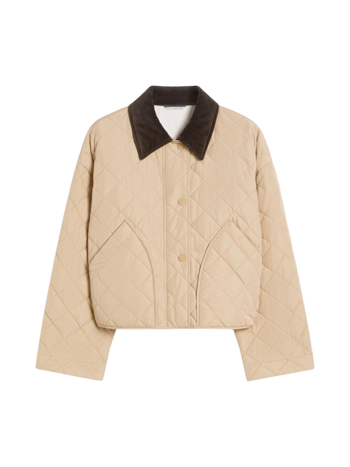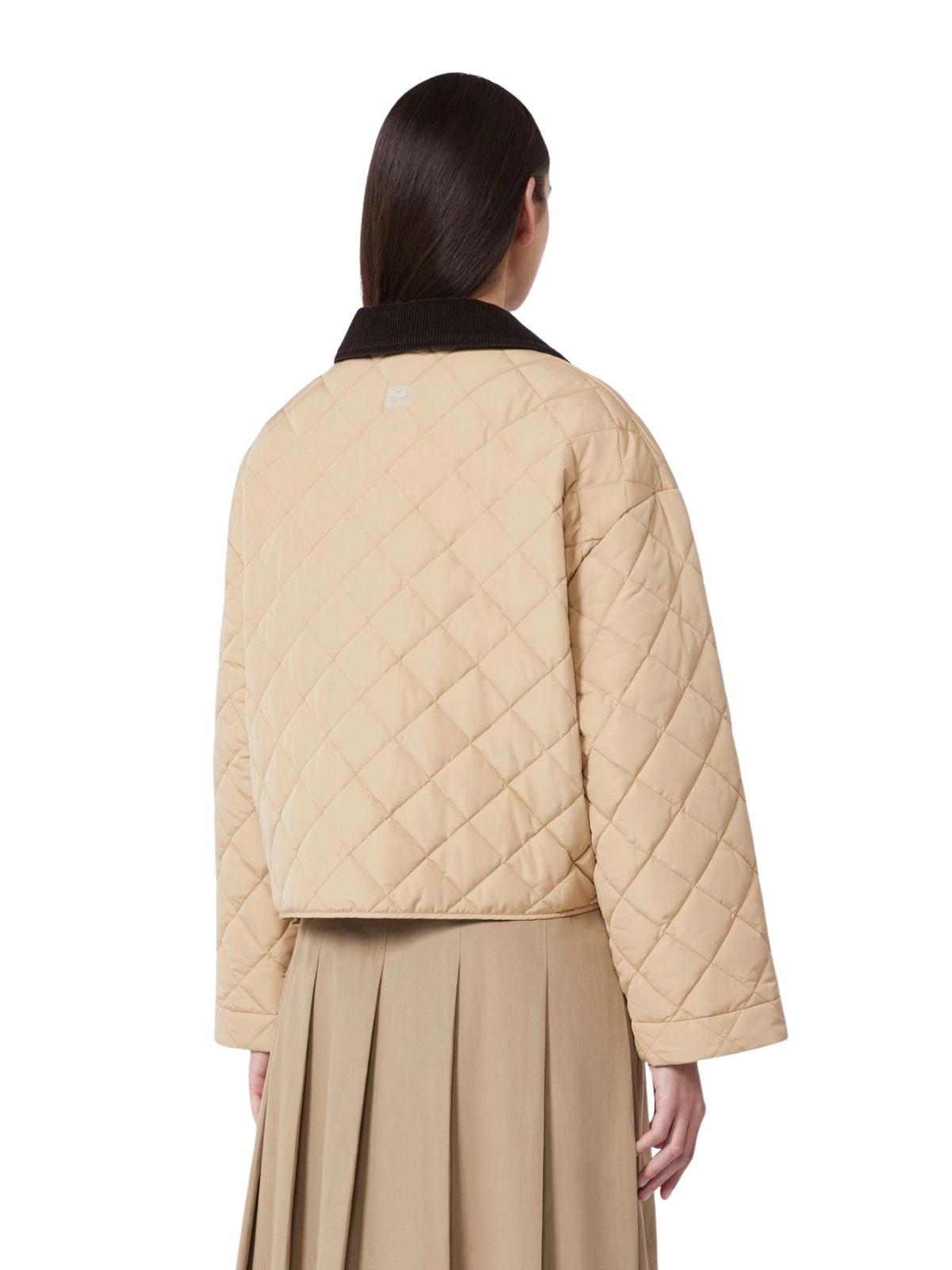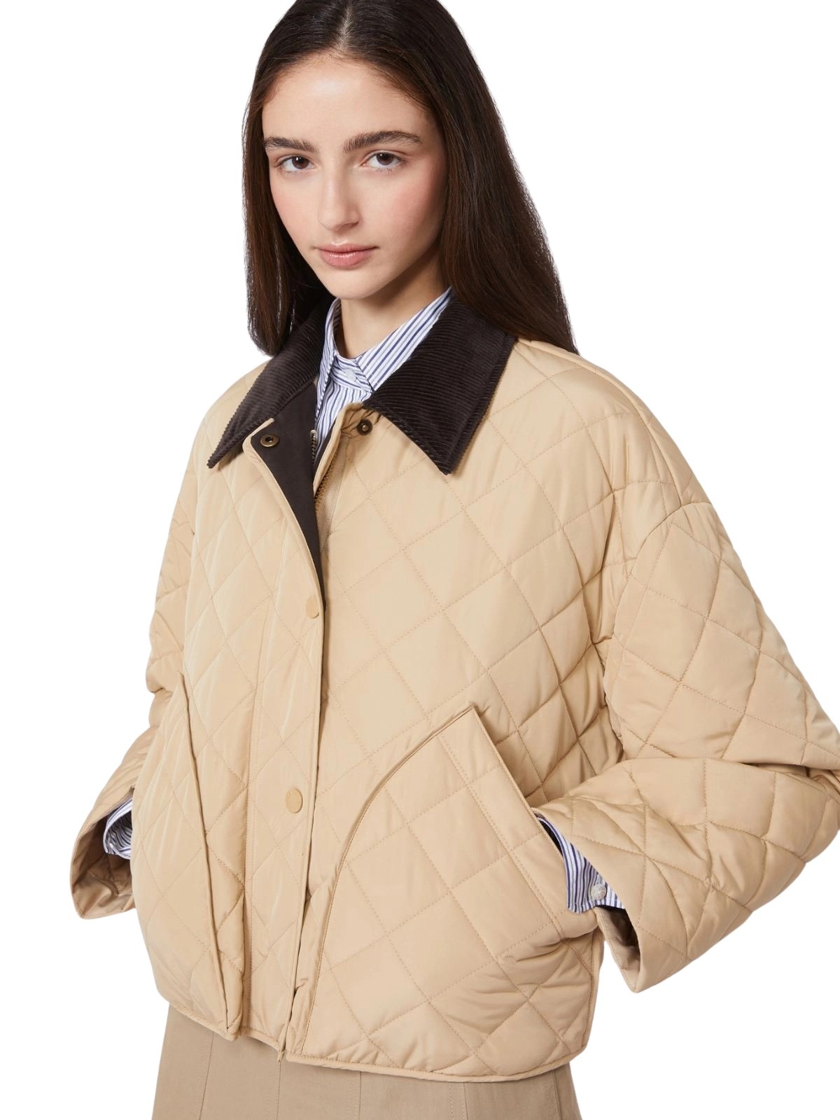 Vendbar, vattert jakke til dame fra Weekend Max Mara, laget i vannavvisende materiale med diamantquiltet struktur. Modellen har en avslappet passform med kordfløyelskrage og praktiske lommer på begge sider. En funksjonell og allsidig jakke som enkelt kan styles til både hverdags og fritid.