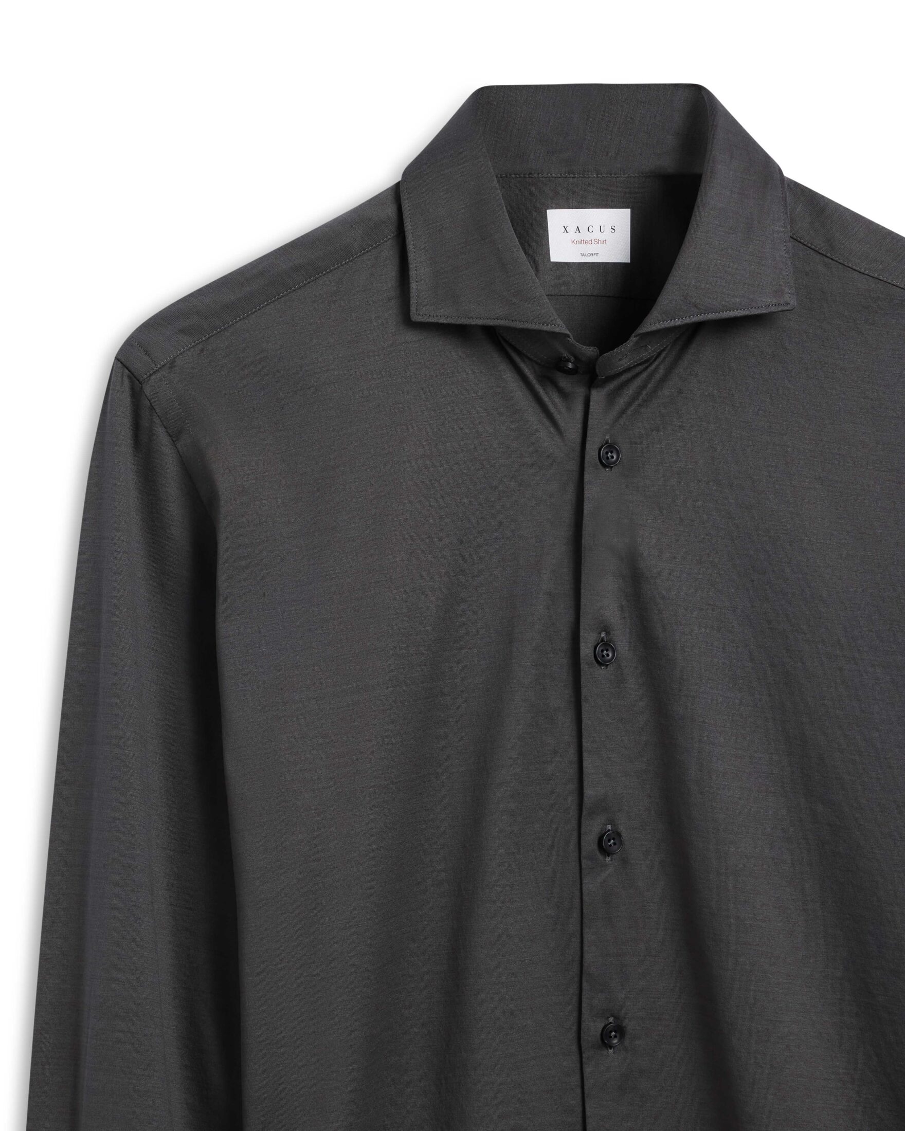 Knitted Shirt Tailor Fit fra Xacus. Laget i myk bomullsjersey som gir naturlig stretch og høy komfort. Den har et stilrent uttrykk med smal passform som sitter pent på kroppen. En perfekt kombinasjon av skjorte og komfort, ideell både til blazer og mer avslappede antrekk.
