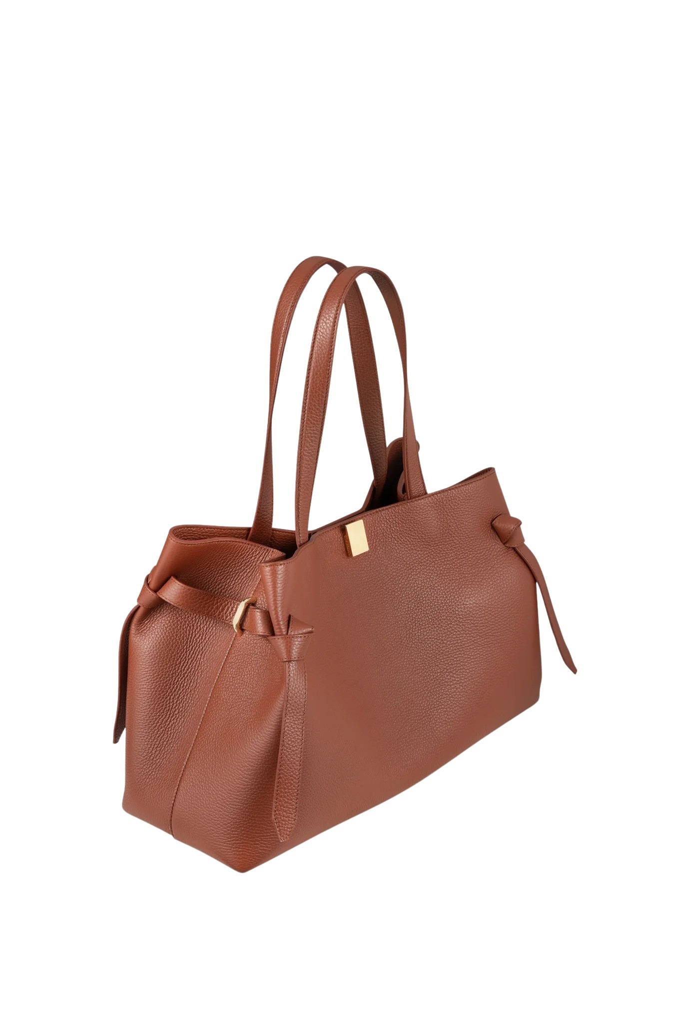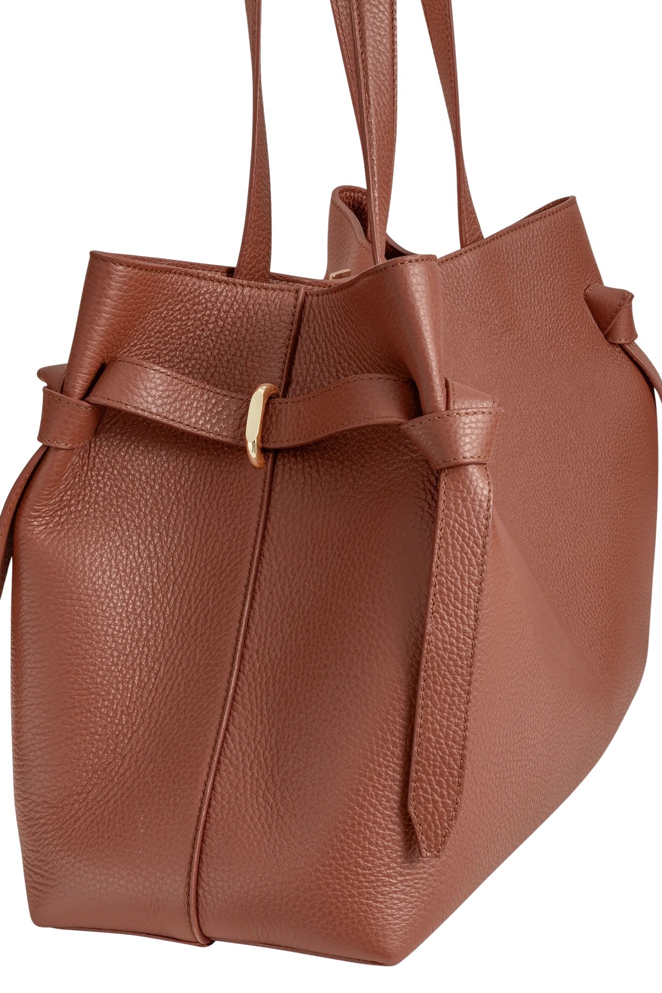 Elegant og allsidig veske fra Yuzefi i brunt skinn. Med sitt romslige interiør og strukturerte design er det den perfekte balansen mellom stil og funksjonalitet for daglig bruk. Vesken lukkes med magnet og bæres med håndtak. Håndlaget av håndverkere i Spania.