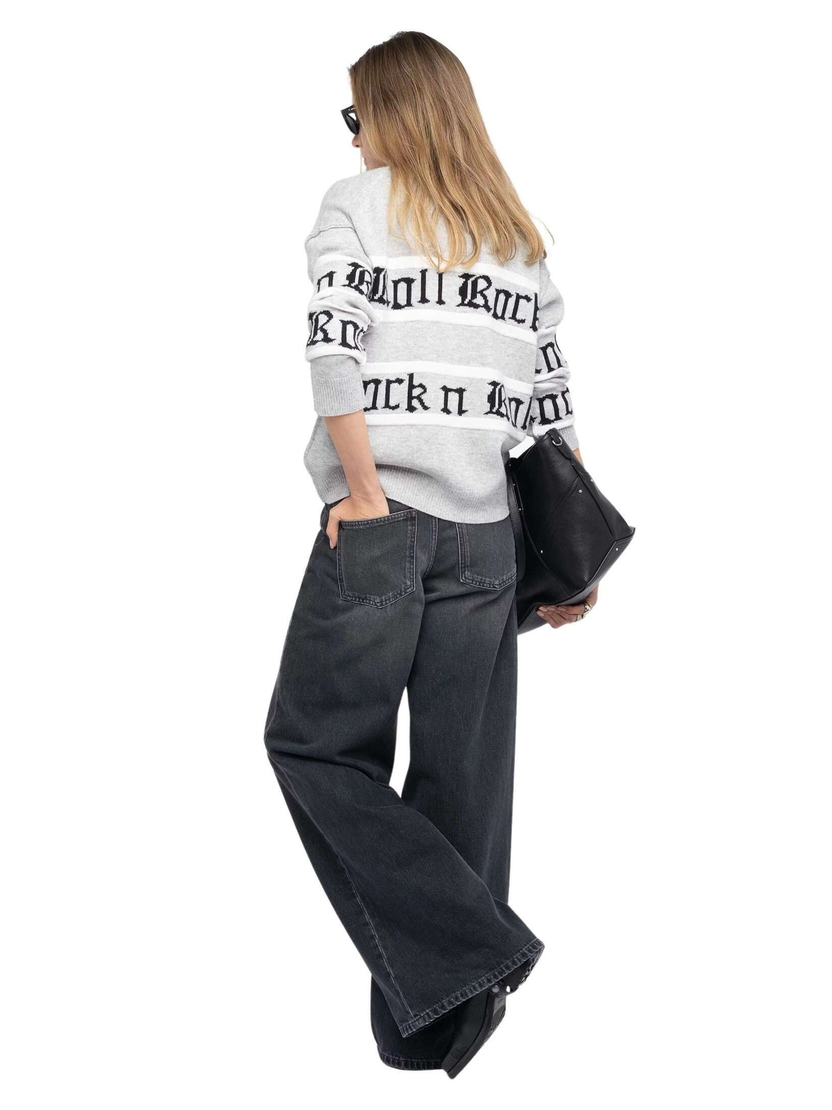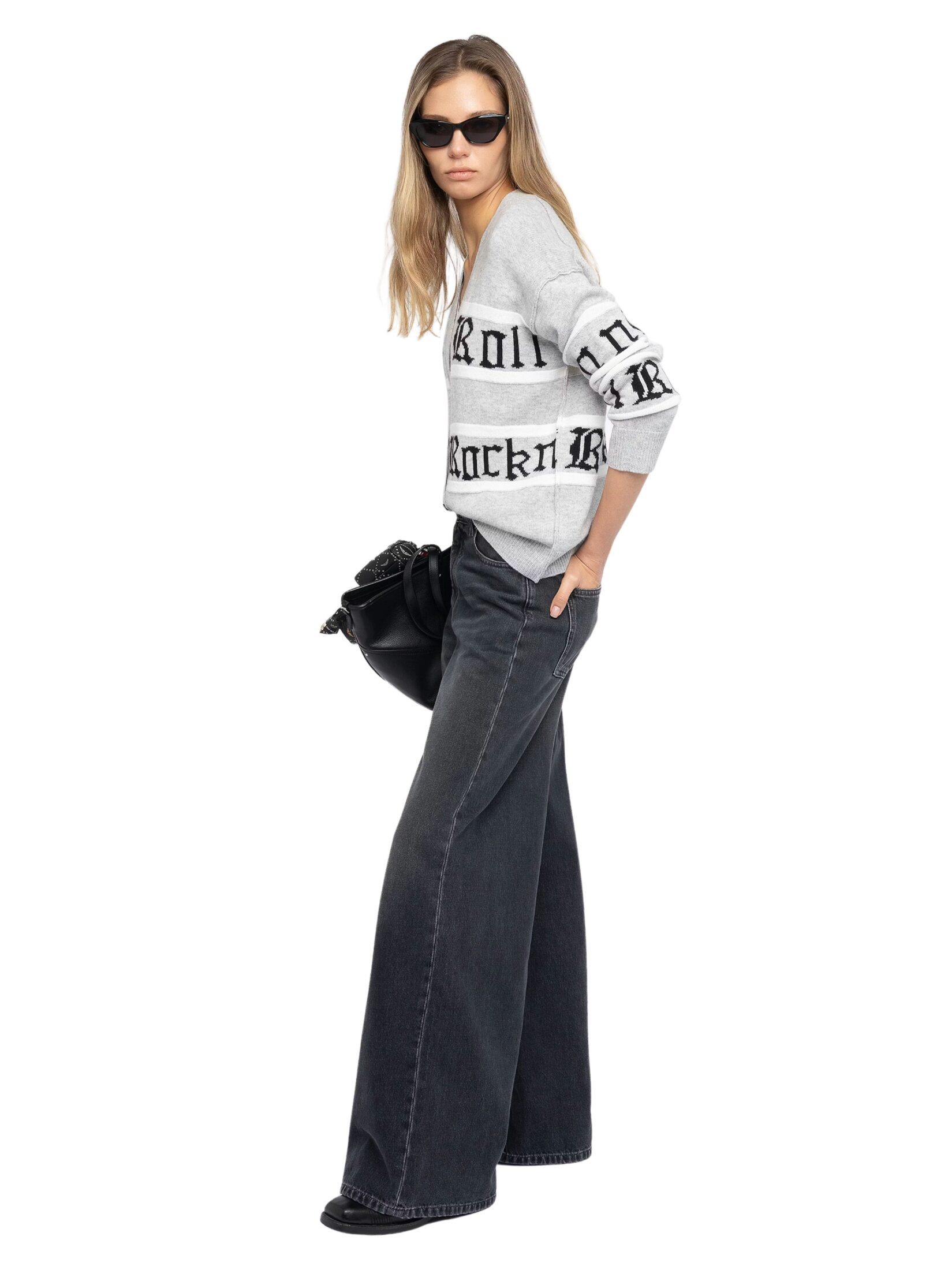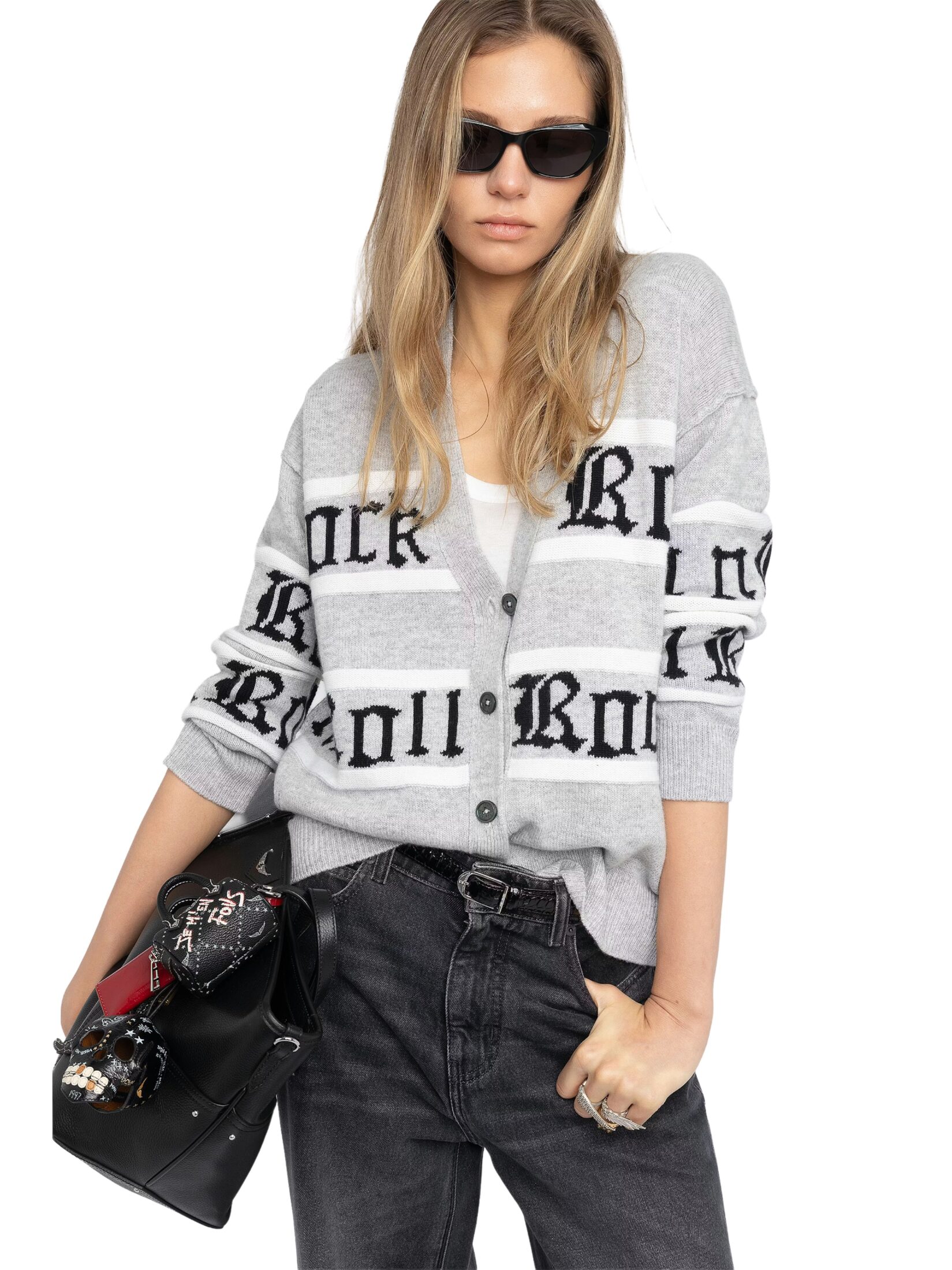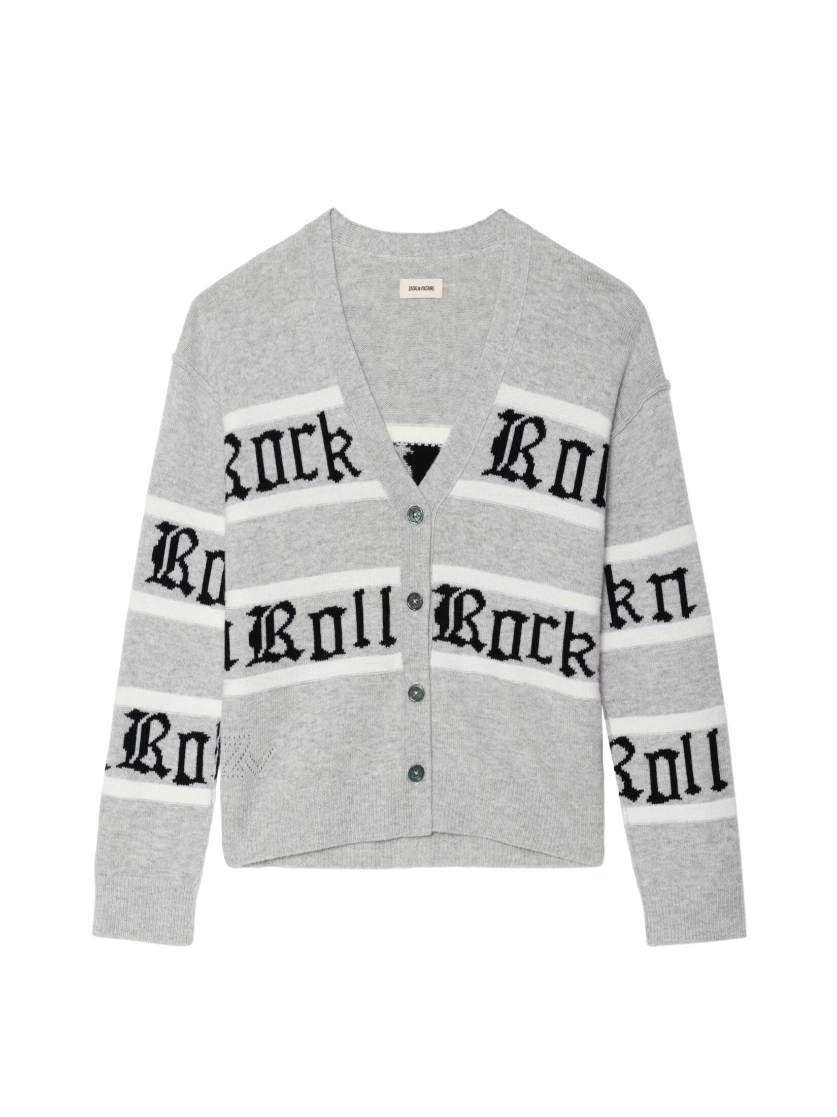 Cardigan til dame fra Zadig & Voltaire, strikket i en eksklusiv blanding av ull og kashmir. Modellen kombinerer klassiske striper med «Rock n Roll»-intarsia i jacquard som gir et karakteristisk og edgy uttrykk. V-hals og knappelukking i front gjør den enkel å style, enten alene eller lag-på-lag.