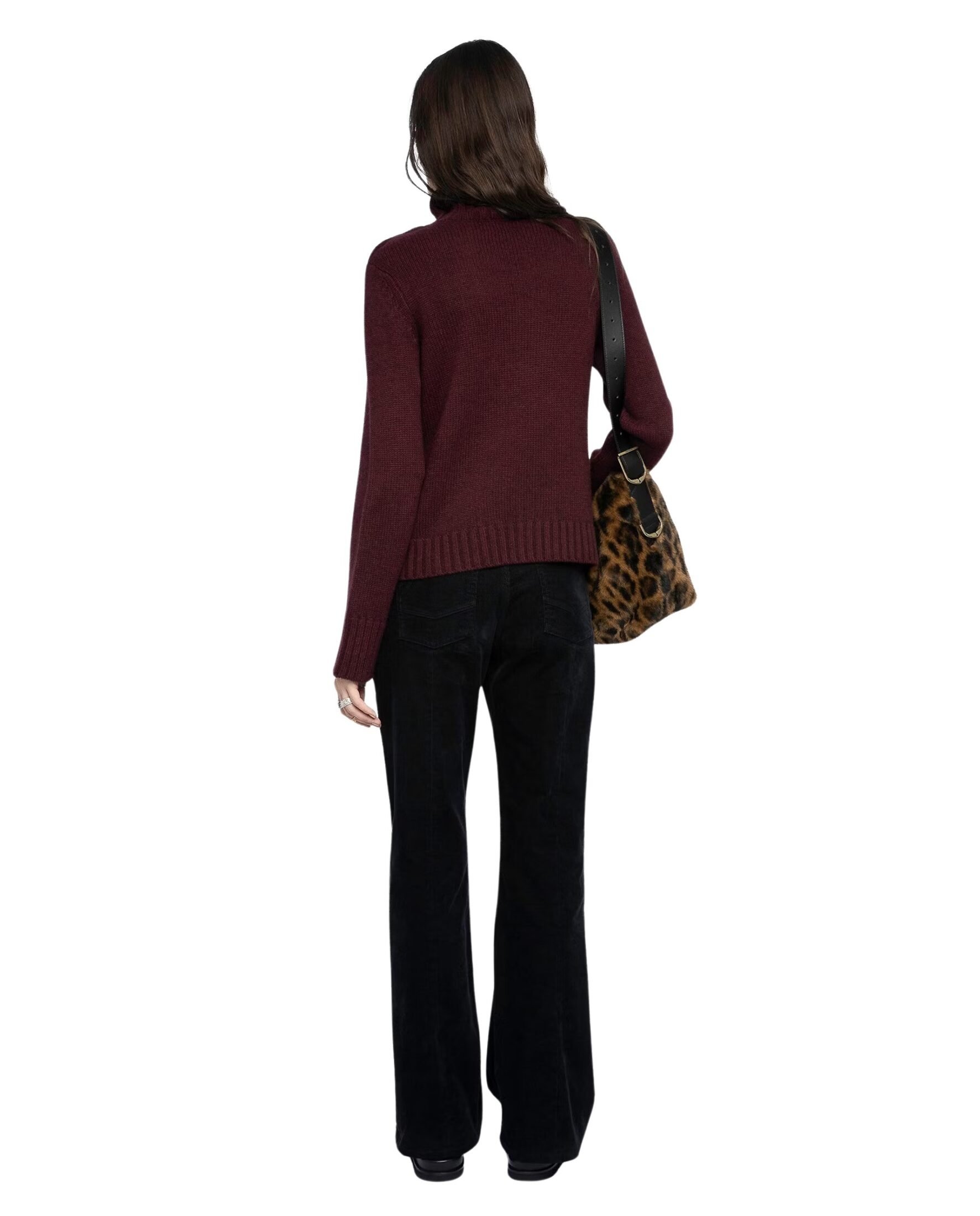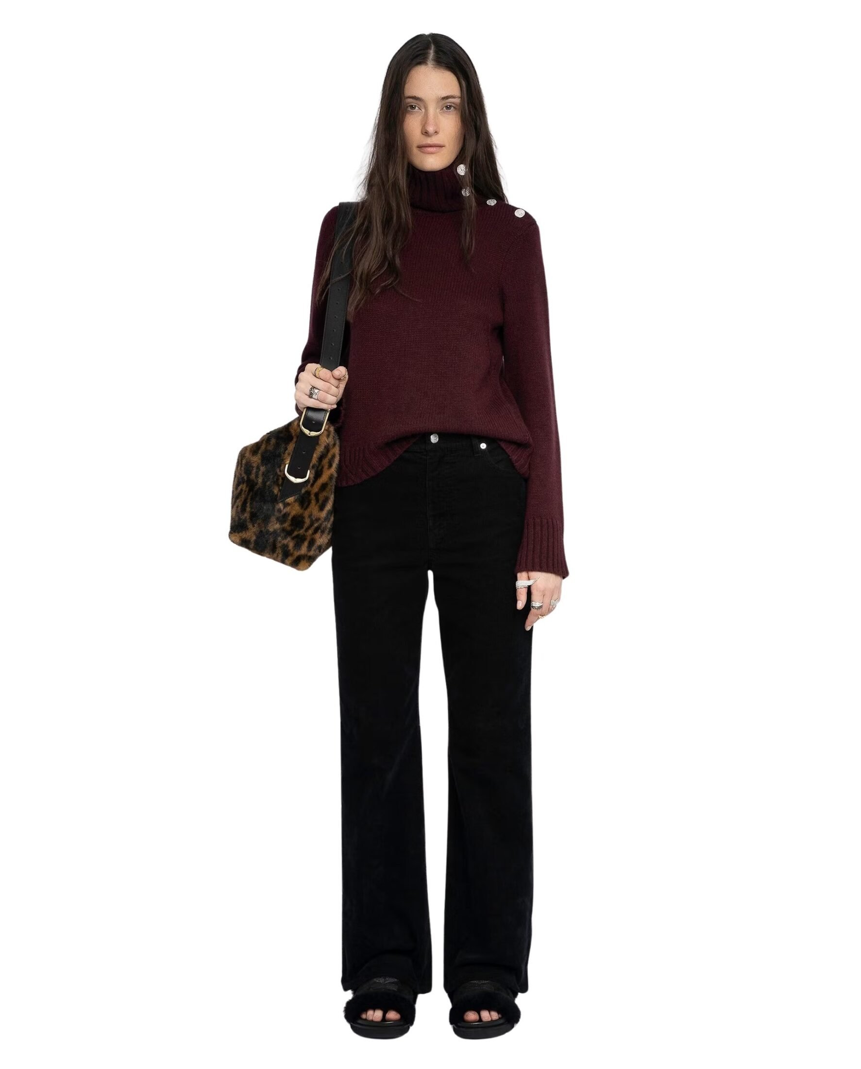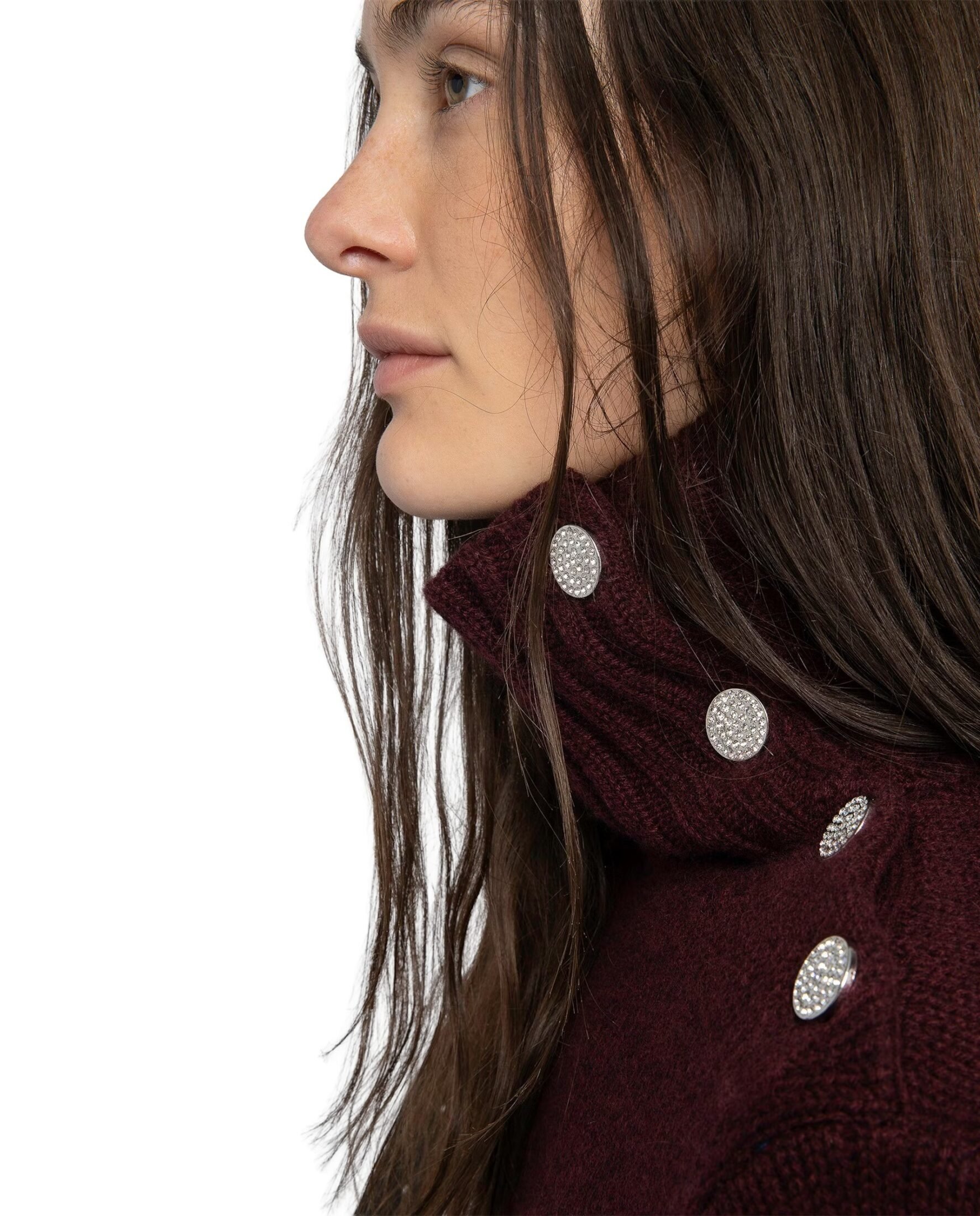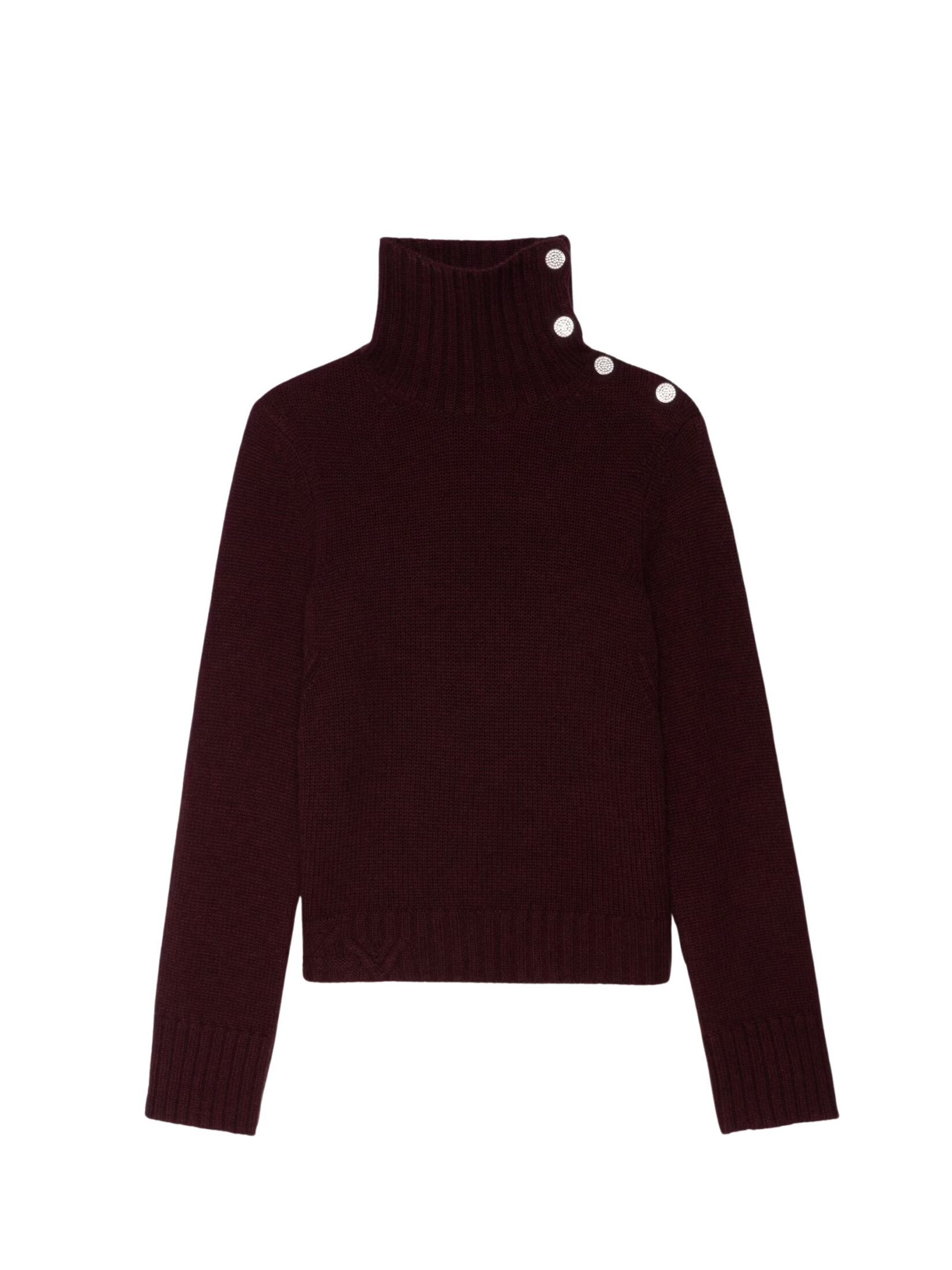 Genser til dame fra Zadig & Voltaire. Elegant og tidløs genser i 100% myk kasjmir. Den dype vinrøde fargen gir et sofistikert uttrykk, mens den høye halsen med dekorative glitrende knapper i skulderen tilfører et moderne og feminint preg. Perfekt både til hverdags og til mer pyntede anledninger. Et luksuriøst plagg du vil bruke igjen og igjen.